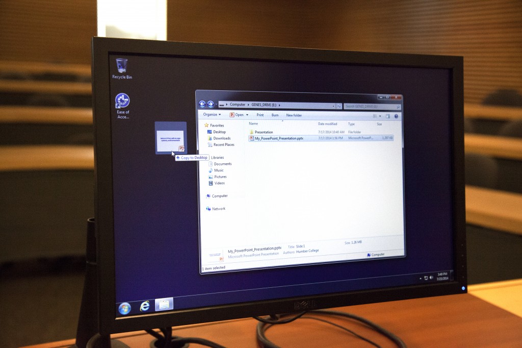 It’s recommended that you drag and drop your presentation onto the desktop of the computer. That way, you can retrieve your USB stick or disc right away and remove any chance of forgetting it after class when you may be rushed by students asking questions or by the following class waiting to use the room. The computer reverts to its original image when logged off, so any data you load onto it will be erased when restarted.