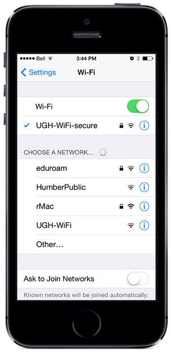 The blue checkmark next to UGH-WiFi-secure indicates you are now connected!