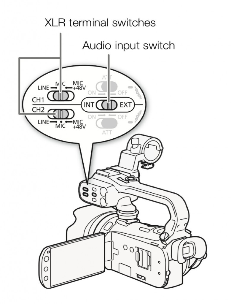 - To use the shotgun mic: set the Audio input switch to EXT and the CH1 XLR input switch to MIC +48 You can’t record from the internal and external mic at the same time!